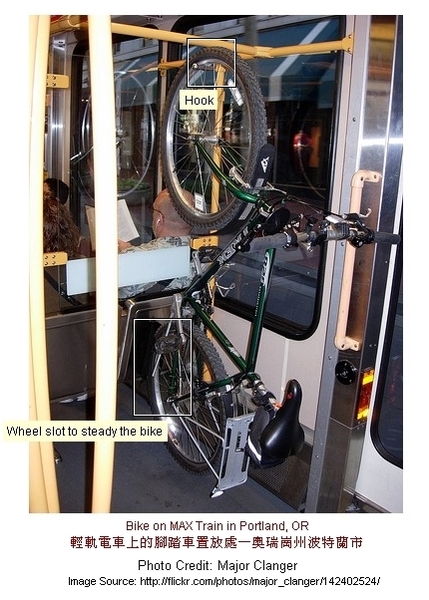 奧勒岡州波特蘭市的輕軌電車(Light Rail)上,也有人這麼放自行車。 (看大圖)