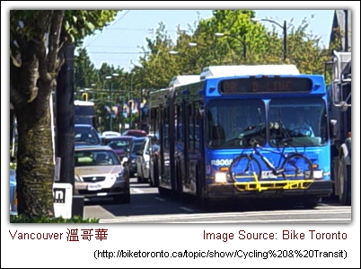 這是加拿大溫哥華的公車,車頭前方也有腳踏車架。